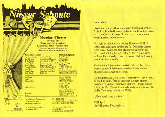 letzde Friedach es de desjöhrije Sessjon vom Laiethiaterkreppe “Nüsser Schnute“ jestartet. Met „Merr send dann ens fott“. E dönn Klamaukstöckske för zom Schenkelkloppe. Verfasst von Jettens Jonas. De Premjährevörstellong jeng tradezjonsjemöß en Weckhove öwer de Böhn. Em Jemeendesäälche op de Höttestroß. De Lade widder rabbelvoll. “Usverkooft“ es enzwesche bei Opföhronge von de Nüsser Schnute fass schonn Standard. Hatt erärbiedt vom Schnuute-Ongsombel meddels 23 erfolchreeche Enszeneeronge en 2wee Dotzend Jöhr. Entsprechend hoch wor dann och de Erwahdongshaldong vom jeneichte Poblekom. Zorecht? Sare mer et mol eso: Et jov vill Leech – on e besske Schadde. De Schnuute hannt et sech met de desjöhrije Enszeneerong nit leecht jemaht. Wies em Proloch verköndet, wohde doför sojah dree Reschissöre benödicht. Weil mer dobei onwellkörlech draan denke moss, dat vill Köche dr Brei verdärwe, wor mr natörlech dubbelt jespannt, op dat wat kütt. Dann jeht de Vörhang op.
